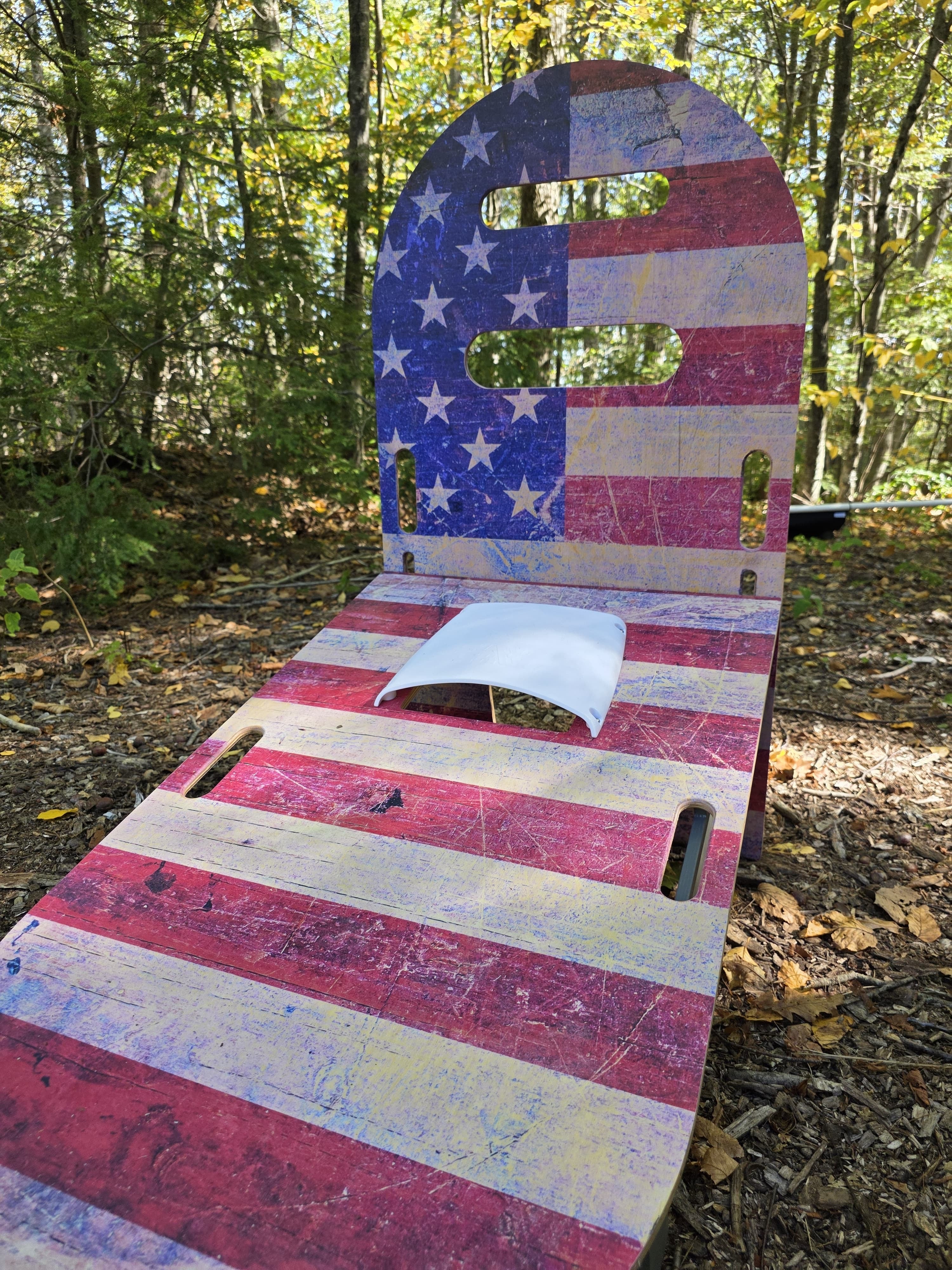 SlotShot is played with two sets of boards; each set includes a Backboard and an inclined Baseboard with foldable legs. The Baseboard features a Scoop with a hole on the front, while the Backboard has two slot holes. Rubber frisbees are used in gameplay to score points. Landing a frisbee on the Baseboard is worth +1 point, making the throw into the Scoop hole is +3 points, into the lower slot hole on the Backboard is +5 points, and into the top smaller slot hole on the Backboard is an automatic win — first team to reach 21+ points wins the game! See our User Manual and/or our How-to page for full game rules.
