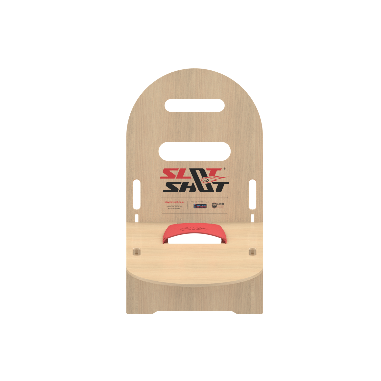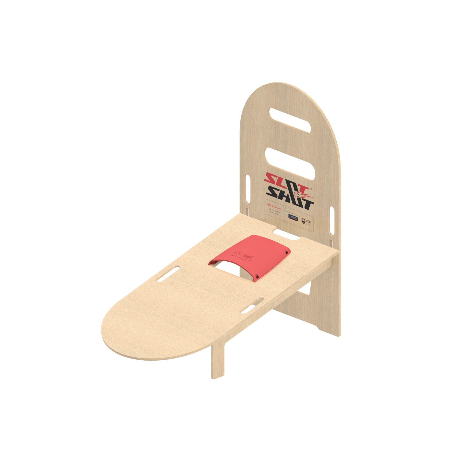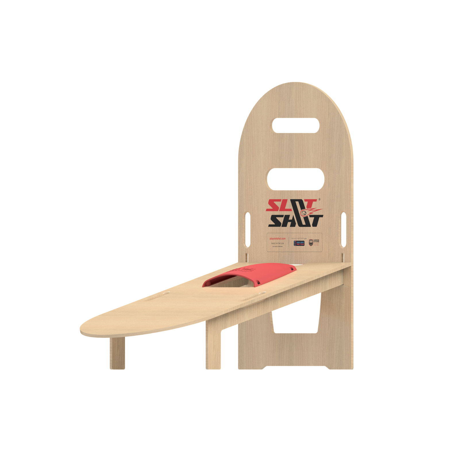 SlotShot is played with two sets of boards; each set includes a Backboard and an inclined Baseboard with foldable legs. The Baseboard features a Scoop with a hole on the front, while the Backboard has two slot holes. Rubber frisbees are used in gameplay to score points. Landing a frisbee on the Baseboard is worth +1 point, making the throw into the Scoop hole is +3 points, into the lower slot hole on the Backboard is +5 points, and into the top smaller slot hole on the Backboard is an automatic win — first team to reach 21+ points wins the game! See our User Manual and/or our How-to page for full game rules.